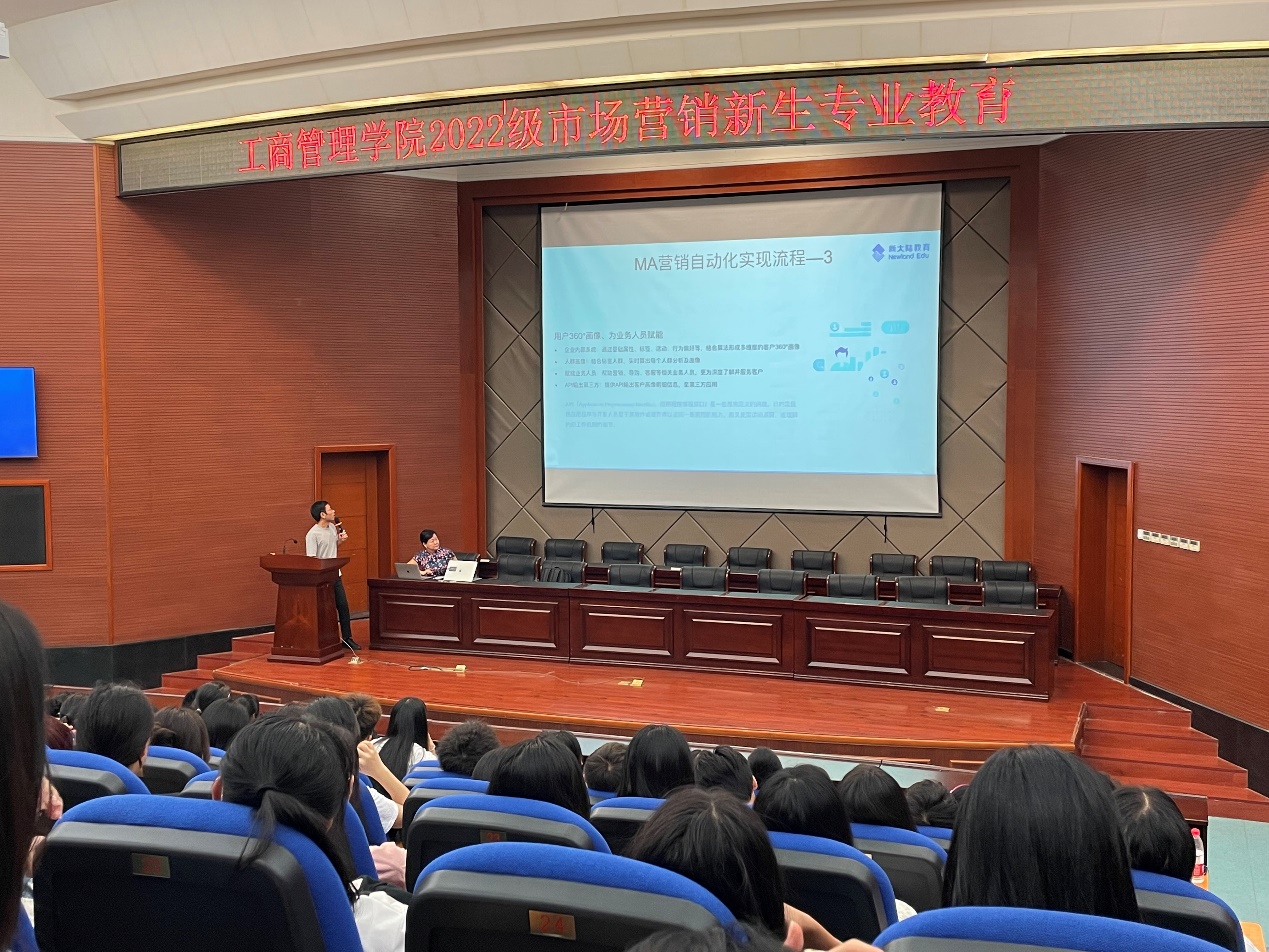专业介绍会上,副院长、学科带头人严谨教授从认识大学篇、新生过渡篇、习惯养成篇、反诈防贷篇、职业规划篇等多个方面,对市场营销专业的学科背景、实训条件、师资力量、实习就业、校企合作单位及学生成长途径等情况做了全面的介绍。此外,还给新生们提出专业的学习建议,帮助新生们树立明确学习计划和目标,做好自己的职业规划,鼓励他们努力创造属于自己的辉煌。会议还邀请到了新大陆教育集团林志斌老师分享了商务数据分析的相关内容,现场同学认真聆听,师生积极互动,氛围融洽和谐。