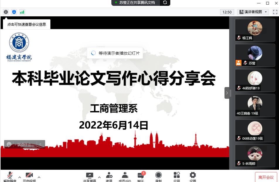 为帮助本科生解答毕业论文写作的疑惑,提高毕业生论文写作能力,6月14日晚上7点,工商管理系通过腾讯会议举办了本科毕业论文写作心得分享会,讲座由2019级物业管理专业苏莹同学主持,邀请了物业管理专业应届毕业生连保凯、林雨婷、胡素宁三位同学做经验分享,李冰老师和苏小凤老师莅会指导,2023届物业管理专业毕业生和其他年级的学生积极参会学习。