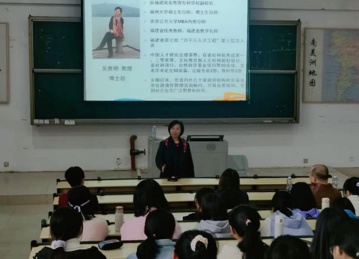 12月2日下午,中共福建省委党校二级教授、享受国务院特殊津贴专家、博士生导师、原福建商业高等专科学校副校长吴贵明教授莅临我校BB贝博艾弗森原官方网站,为2020级人力资源管理本科专业作《人力资源管理本科生学业规划与职业生涯管理》的讲座。BB贝博艾弗森原官方网站院长章月萍教授、人力资源管理系全体教师、辅导员以及2020级人力资源管理本科专业89名学生共计100余人聆听了讲座。
