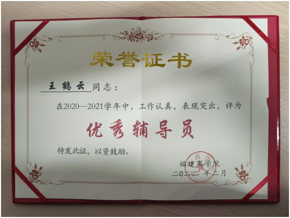 2022年2月24日上午,福建商学院在连江校区明德楼视频会议室召开2021年度宣传思想政治工作会议,机关各部门、各教辅机构负责人,各二级学院党委书记、副书记,全体辅导员等参加会议。贝博官网辅导员王鹤云同志在2020-2021学年中,工作认真,表现突出,被福建商学院评为优秀辅导员。在会议上,校长程灵给获得2020-2021学年优秀辅导员颁奖,王鹤云与其他学院获奖的辅导员一同上台接受领奖。