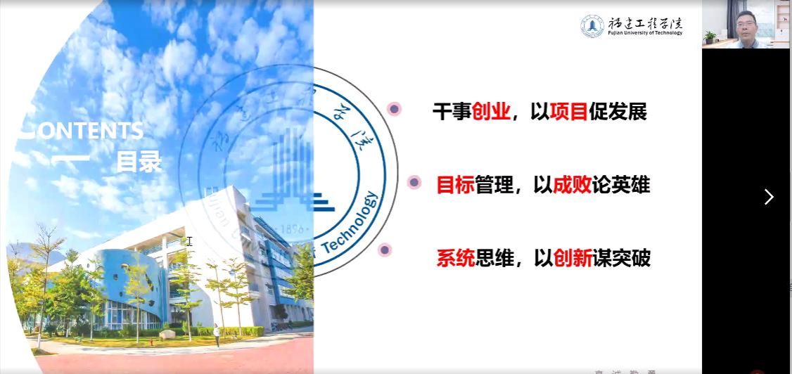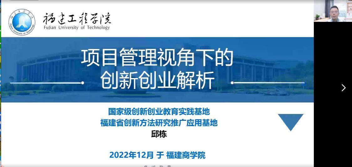 2022年12月6日,贝博官网工商管理系邀请福建工程学院邱栋副教授在线上开展了题为“项目管理视角下创新创业解析”的专题讲座。邱栋副教授为福建工程学院管理学院副院长、硕士生导师,福建省创新方法研究推广应用基地负责人、国家级创新创业教育实践基地骨干、国家级一流本科课程《创新思维与知识创业》骨干、中国技术经济学会复杂科学管理分会理事、国家技术创新方法与实施工具工程技术研究中心创新方法培训师。讲座由工商管理专业负责人陈颖老师主持,工商管理系150余人在线参加了本次讲座。