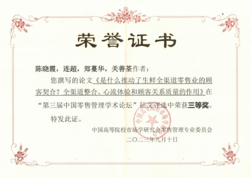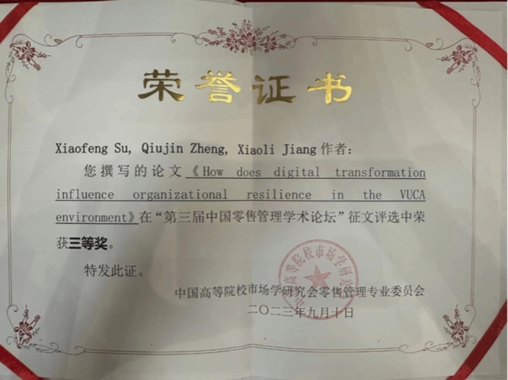 本届论坛贝博官网教师苏小凤等论文《How does digital transformation influence organizational resilience in the VUCA environment》、陈晓霞等论文《是什么推动了生鲜全渠道零售业的顾客契合?全渠道整合、心流体验和顾客关系质量的作用》两篇论文在“第三届中国零售管理学术论坛”征文评选中荣获三等奖。