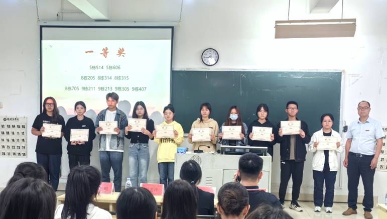 本次评比活动共有138间宿舍报名参加,主要以宿舍卫生、安全和日常表现为评比标准,旨在促进学生营造一个良好的宿舍生活环境。经过多轮评比,最终按综合得分,评出一等奖宿舍10间,二等奖宿舍20间,三等奖宿舍35间,吴思锋副书记与辅导员老师分别为获奖的宿舍颁奖,让我们一起来颁奖仪式现场看一看同学们的风采吧。