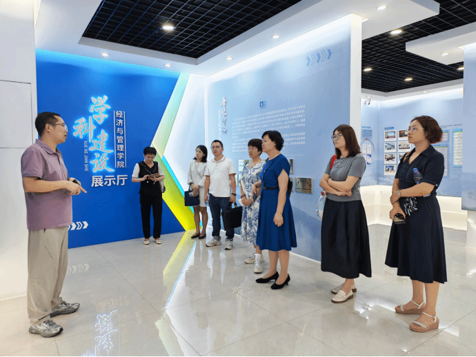 座谈会上,我们与经济与管理学院的领导和老师们进行了深入的交流。首先,主持工作的张桂梅副院长介绍了硕士点培育与建设对提升学院学术影响力、吸引优质生源、增强教研实力方面的重要意义。李想副院长从“明线”“暗线”两个方面,分享了学院旅游管理硕士点培育与建设的具体工作,从师资引进、人才队伍梯队建设、产教融合、教育教学改革成果积累等方面提供了富有借鉴意义的宝贵经验,他指出,在申报过程中,要严格对标对表,提早布局,确保申报材料的科学性、规范性和完整性,尽快弥补不足,提升交叉研究能力,注重提高科研成果的学术影响力,争取承办专业领域学术会议或全国性会议,提升学科建设水平。伍家军教授介绍了市场营销专业转型为数字经济专业的成功经验,目前市场营销专业已停招,数字经济第一志愿录取率达到178%。随后我们与经济与管理学院各系主任、专业负责人就专业设置规划、数智化管理人才培养、一流课程建设、教学案例开发、实践教学以及微专业设置等方面进行了深入交流。学院叶志鹏书记介绍了党建引领业务的业绩和经验,并就产业学院、产教融合、服务地方等工作进行了交流和研讨。