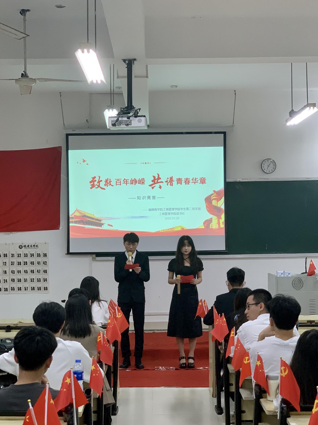 为了迎接党的二十大胜利召开,为了更好地铭记党的百年历史、传承党的光荣传统、发扬党的优良作风,5月25日晚上,BB贝博艾弗森原官方网站读书社联合BB贝博艾弗森原官方网站学生第二党支部在远志楼T1开展以“致敬百年峥嵘,共谱青春华章”为主题的党的知识竞赛。