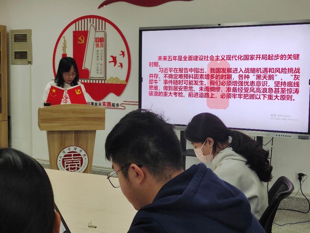 支部副书记许艳萍老师紧扣党的二十大报告原文,从深刻领会党的二十大的主题、主要成果,深刻领会过去五年工作和新时代十年的伟大变革,深刻领会开辟马克思主义中国化时代化新境界,深刻领会中国式现代化的中国特色和本质要求,深刻领会社会主义经济建设、政治建设、文化建设、社会建设、生态文明建设等方面的重大部署,深刻领会坚持党的全面领导和全面从严治党的重大部署,深刻领会以顽强斗争应对风险挑战的要求,深刻领会教育、科技、人才的重大部署,迅速掀起学习宣传贯彻党的二十大精神热潮等九个方面,对党的二十大精神进行系统宣讲和深入阐释。 近日,BB贝博艾弗森原官方网站学生第一党支部副书记许艳萍以“深入学习贯彻党的二十大精神,发挥党员的先锋模范作用”为题作宣讲报告。支部党员及入党积极分子聆听报告。
