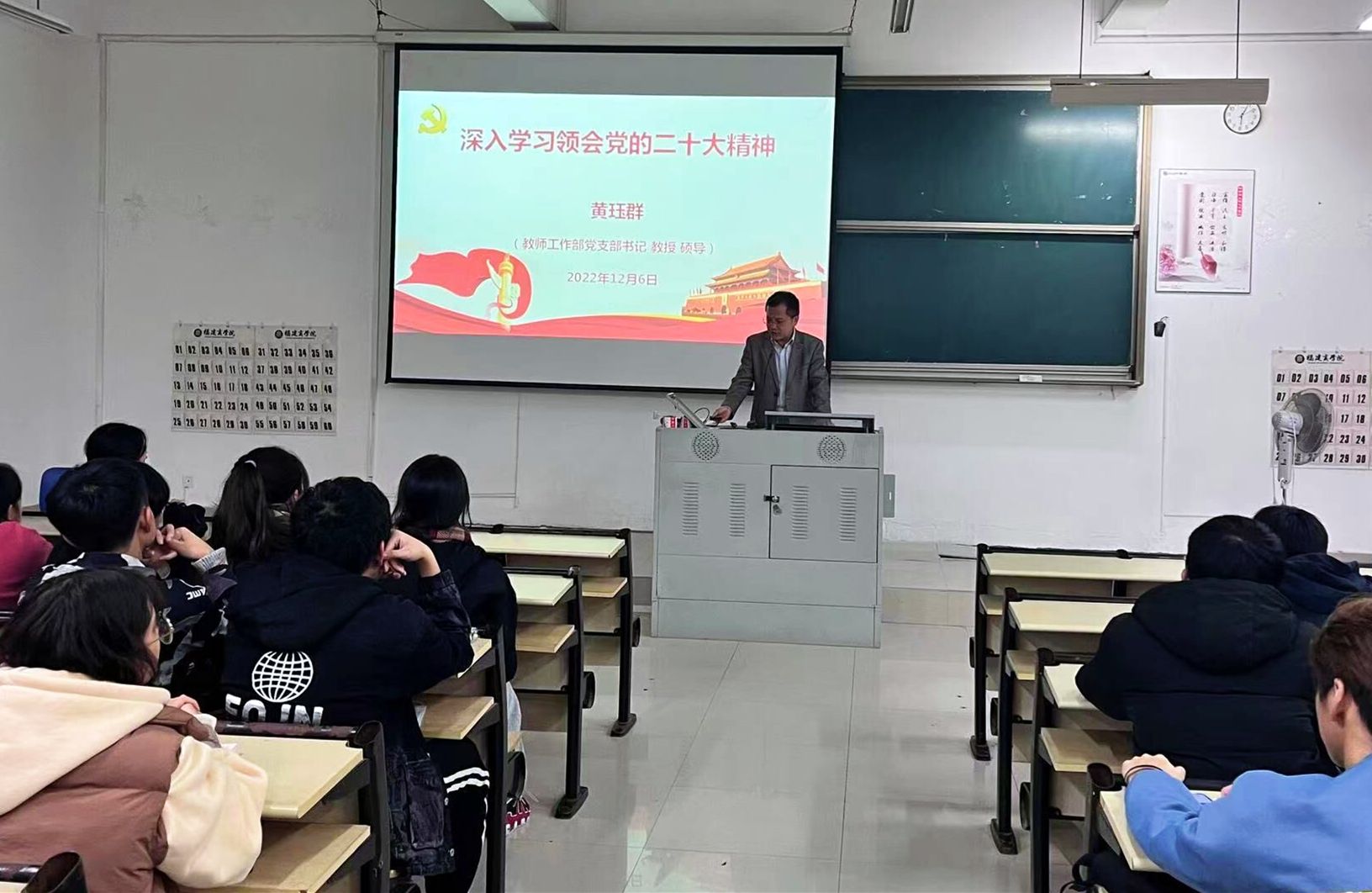 为深入推进党的二十大精神进班级,进学生头脑,根据学校“百名书记进班级宣讲党的二十大精神”工作安排,2022年12月6日晚,教师工作部党支部书记、硕士生导师黄珏群教授赴BB贝博艾弗森原官方网站2022级物流管理专业班级宣讲党的二十大精神,讲座在马尾校区笃行楼T1阶梯教室举行,2022级物流管理专业1、2班共计110余学生参加了宣讲会。