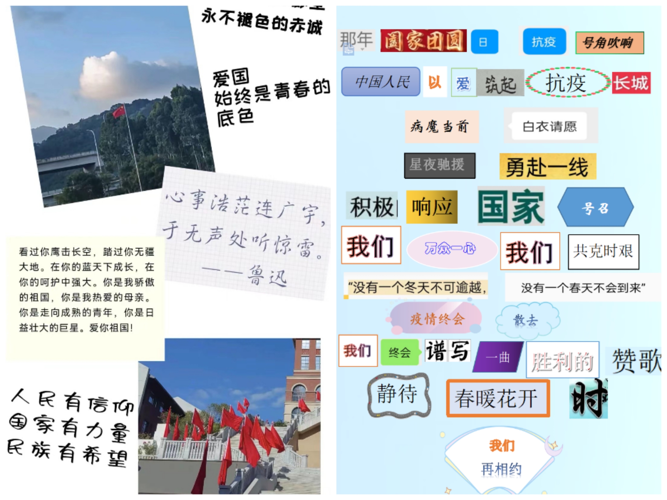 将身边的废弃报纸、杂志以及其他书面来源的词语、短句剪下来后,按照自己的灵感再创作,拼贴而成的新作品就叫做拼贴诗。本次拼贴诗作品征集活动要求同学们紧扣“抗疫”、“正能量”、“青春”、“爱国”等主题,立意新颖,中心思想突出,内容积极向上。活动设有一、二、三等奖,获奖同学将获得奖状及精美小礼品一份。同学们积极投入创作,一张张作品体现了同学们的创意,其内容包括了对祖国的赞美与热爱、对青春的理解与看法等等。
