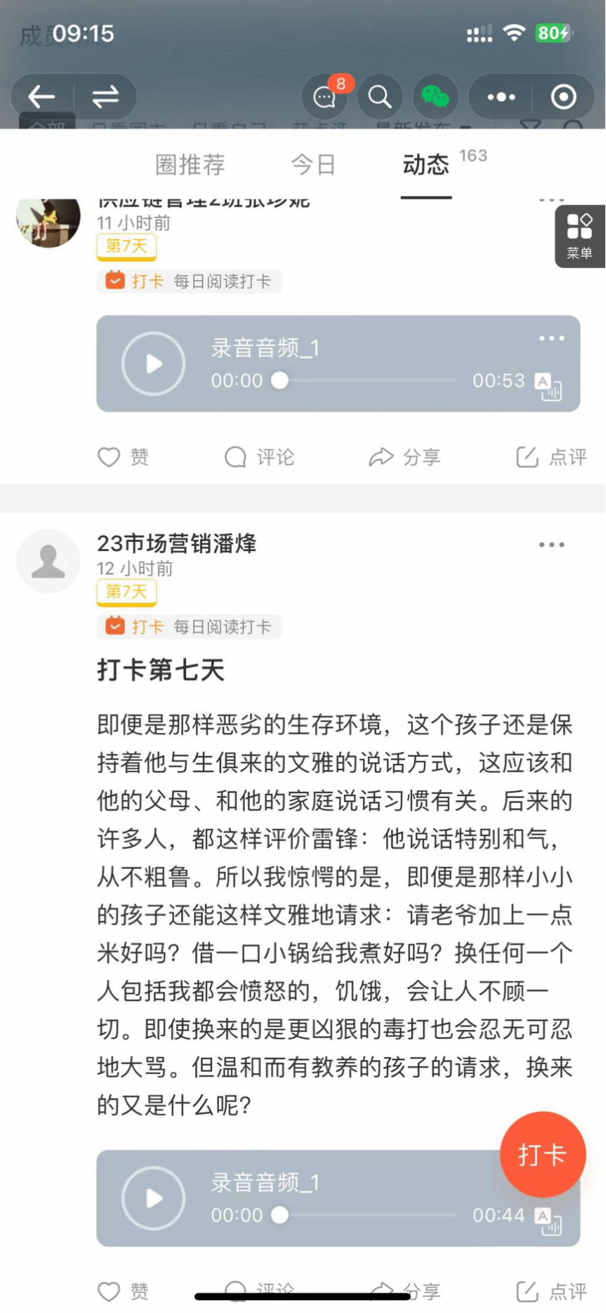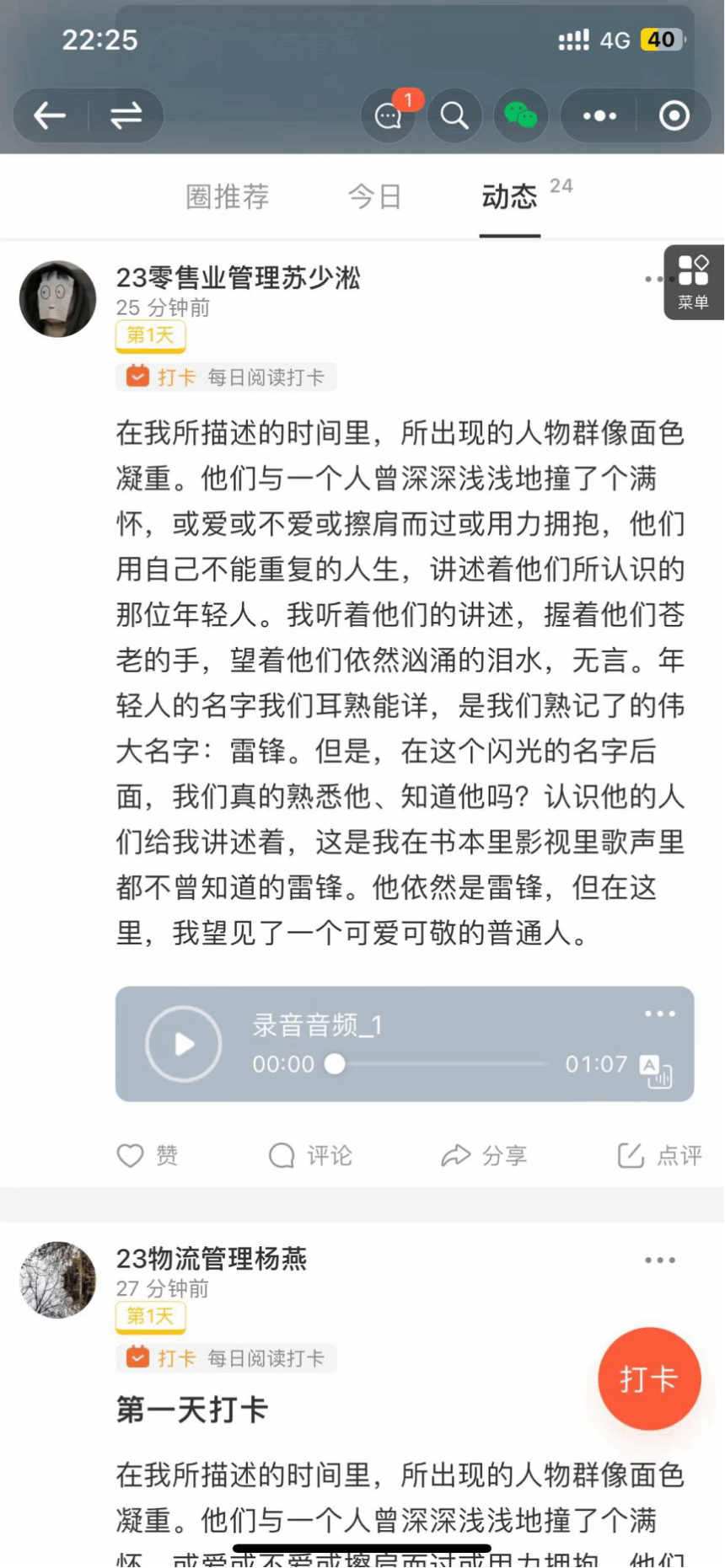 3月4日,为引导同学们养成良好读书习惯,同时深刻学习雷锋精神,传承优良作风,BB贝博艾弗森原官方网站读书社于线上举办为期7天的“传承优良作风,争做时代新人”诵读打卡活动,2023级读书社社员参与了本次活动。