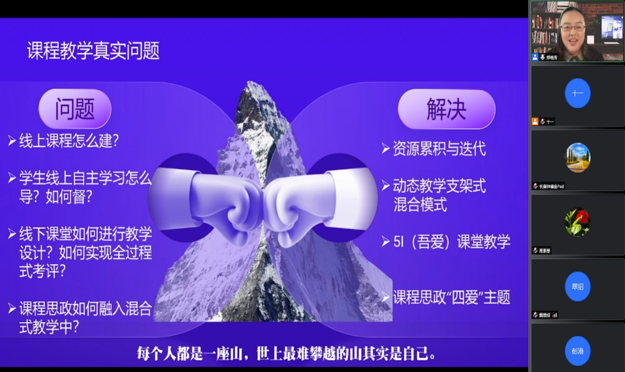 郑艳芳教师为福建省一流本科线上线下混合式课程、一流本科线下课程负责人,相关教学成果获得国家级教学成果奖二等奖、福建省教学成果奖特等奖等荣誉。她结合五年来混合式教学探索历程,围绕着真实课程教学诸多问题,包括“线上课程怎么建,学生线上自主学习怎么导,如何督;线下课堂如何进行教学设计,如何实现全过程式考评,课程思政如何融入混合式教学中”等,提出资源累积和迭代的策略,创设了动态教学支架式混合模式、5I(吾爱)课堂教学模式和课程思政“四有四爱”融合主题。她的精彩分享,获得与会老师的一致好评,帮助老师们破除对混合式教学新模式的恐惧,学会利用在线平台实现有效地混合,确保线上教学实质等效。