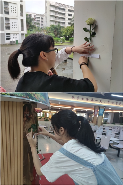 本次活动会在学校的各个角落贴上玫瑰,并附上一句句富有深意的短句,如“祝你所求皆如愿,所行化坦途,多喜乐,长安宁”、“如果没有躺赢的命,那就站起来奔跑,如果没有好运气,那就试试勇气吧”等,伴随着玫瑰与文字,浪漫与善意的氛围充满整个校园。如电影《送你一朵小红花》中所说“送你一朵小红花,奖励你人生第一回积极主动”,希望同学们带着这份善意去温暖身边的人,在感受温暖的同时也在心中种下一枚善意的种子,将这份爱心与浪漫传递给下一个相遇的人。