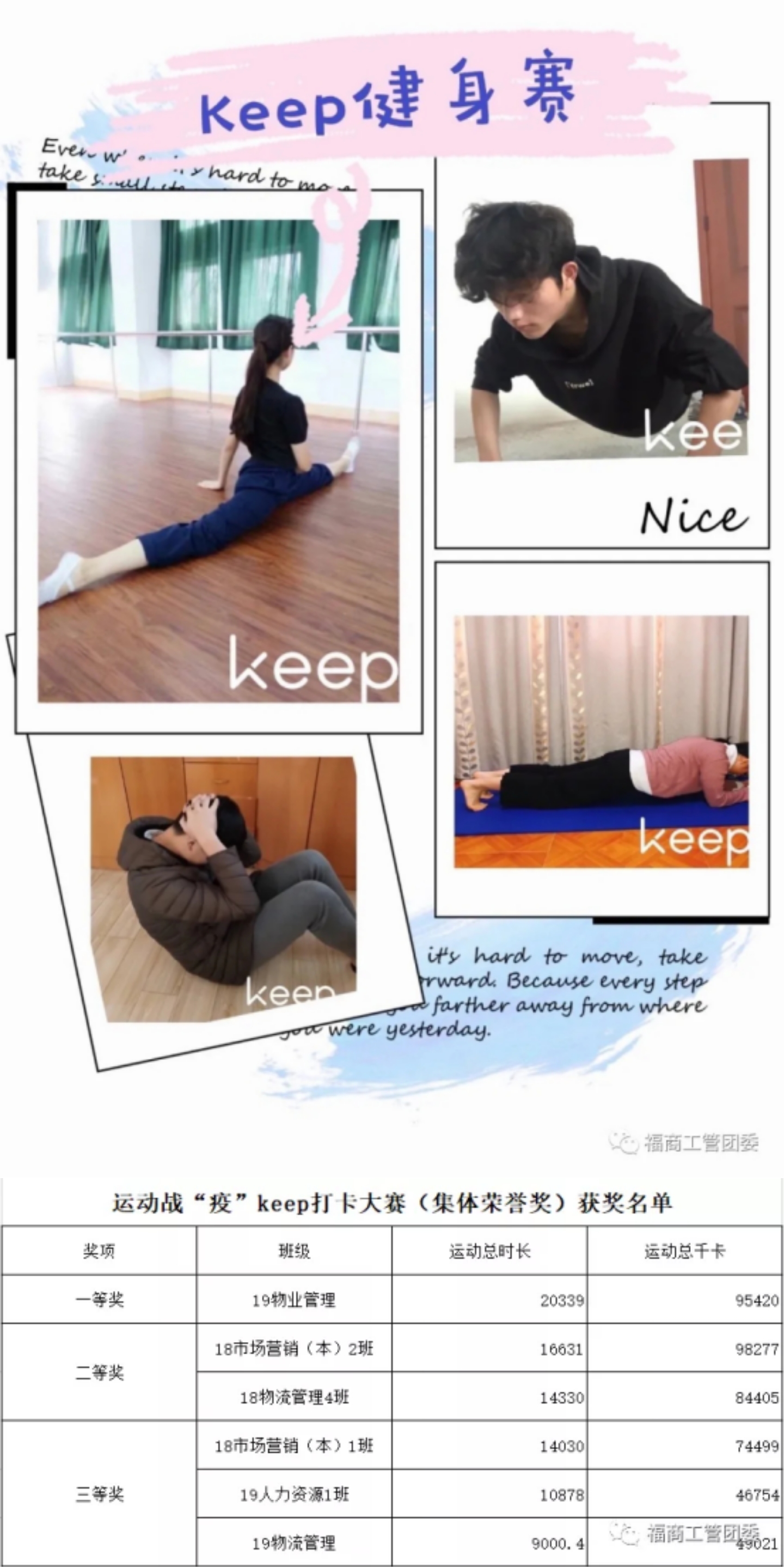 本次活动充分调动了学院学子对健身运动的参与热情和积极性,使学生在参与活动中,感受到运动的快乐,意识到健身锻炼的重要意义,从而培养长期运动的良好习惯,进一步在全学院营造“全民健身,有益身心,增强体魄,促进发展”的良好氛围。“没有机会看见这春天的人,给了无数人拥抱春天的机会”,为了进一步贯彻习近平总书记关于新冠肺炎疫情防控的重要讲话和落实福建商学院的体育运动精神,让福商学子们以更加昂扬的斗志,更加健壮的体魄,持续健康地投入疫情斗争和学习任务中去,BB贝博艾弗森原官方网站开展了“运动战‘疫’工管在行动”Keep打卡健身活动。