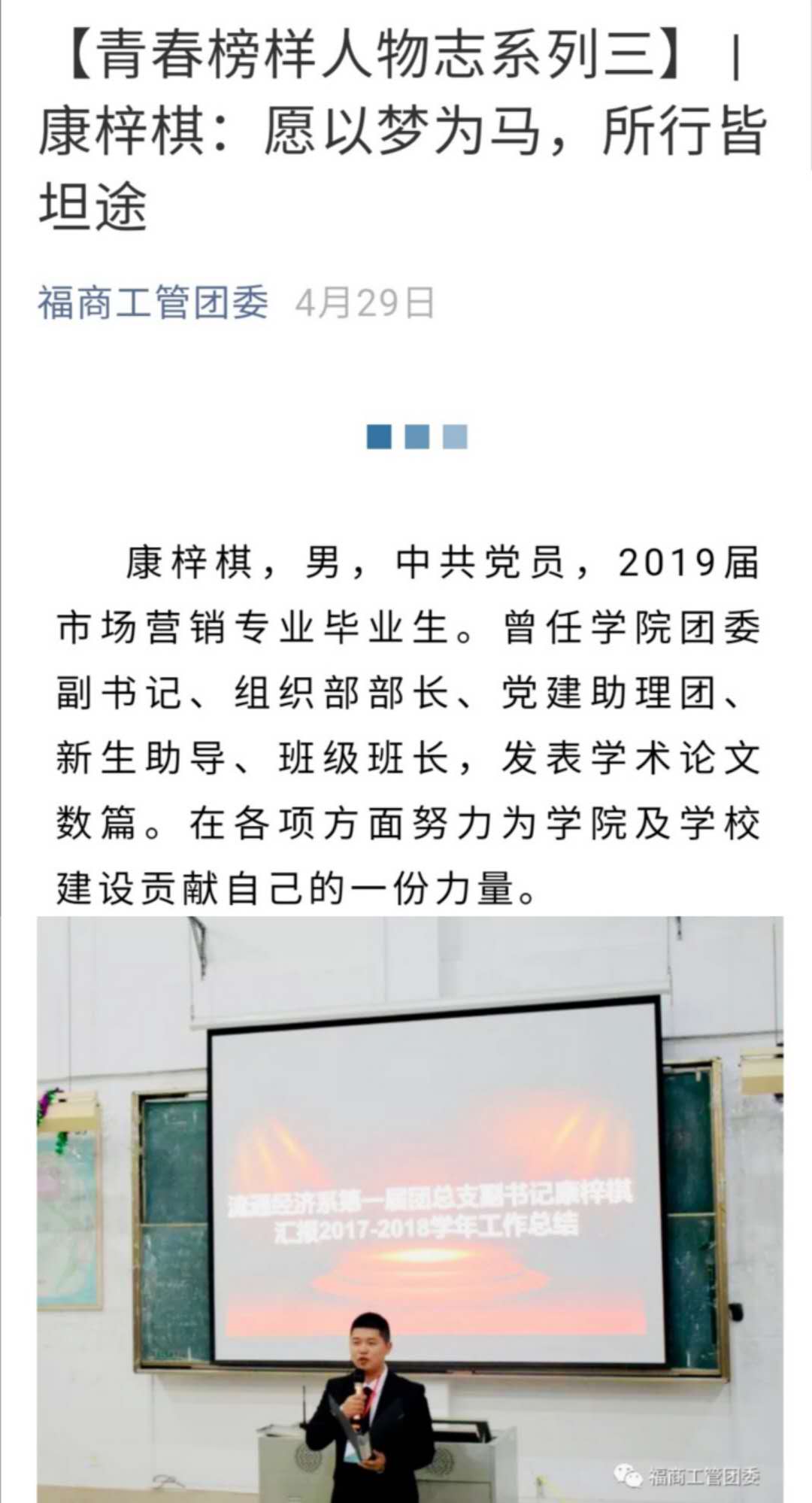 开展“青春故事汇”事迹分享活动。认真从贝博官网当中选出有代表性的学生,收集符合条件的学生资料开展“青春故事汇”事迹分享活动,给学院全体同学树立良好的学习榜样,激励贝博官网全体同学更加紧密地团结在以习近平同志为核心的党中央周围,进一步坚定制度自信,深刻认识作为共产党的后备军,作为共青团的一员,作为BB贝博艾弗森原官方网站的一份子,每个人都需认真配合国家要求不忘初心、牢记使命,不惧风雨、勇挑重担,为夺取新时代中国特色社会主义事业伟大胜利、奋力谱写新时代福建发展新篇章而努力奋斗。