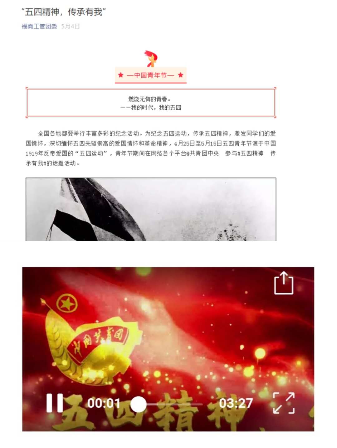录制“五四精神,传承有我”主题视频以及公众号推文。BB贝博艾弗森原官方网站全体干部编辑录制“五四精神,传承有我”视频,获得学院的一致好评,公众号推文包括对此次活动的全方面推送,同时也对五四精神进行了解读,对师生代表的学习心得进行推送,充分营造众志成城、团结一心战胜疫情的浓厚氛围。同时也激励了同学们更加紧密地团结在以习近平同志为核心的党中央周围,进一步坚定制度自信,不忘初心、牢记使命,不惧风雨、勇挑重担,为夺取新时代中国特色社会主义事业伟大胜利、实现中华民族伟大复兴的中国梦凝聚起强大青春力量。