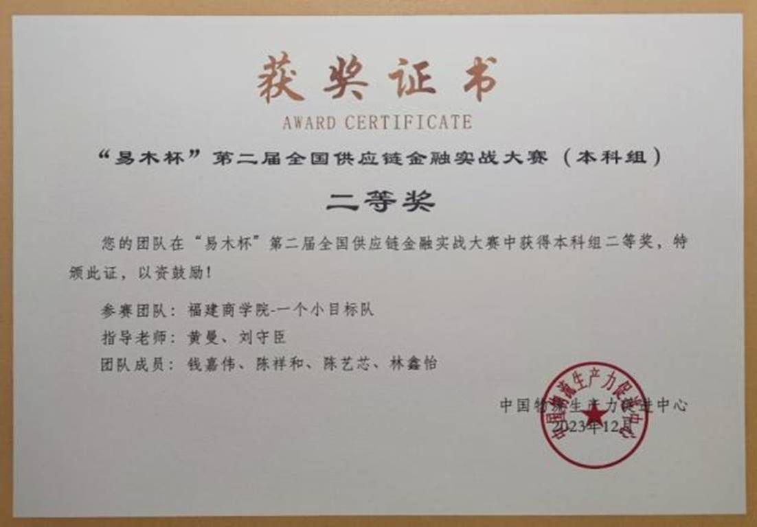 近日,由中国物流生产力促进中心主办,厦门市物流与供应链学会承办,福建省物流行业职业教育指导委员会供应链管理专委会协办的“易木杯”第二届全国供应链金融实战大赛圆满完成。贝博官网物流管理系黄曼、刘守臣老师所指导的学生团队:钱嘉伟(BB贝博艾弗森原官方网站物流管理专业)、陈祥和(BB贝博艾弗森原官方网站市场营销专业)、陈艺芯(金融学院金融工程专业)、林鑫怡(金融学院金融工程专业),学生团队刻苦训练、配合默契、发挥各自专业优势、经过激烈角逐,决赛全国排名20,荣获本科组二等奖。