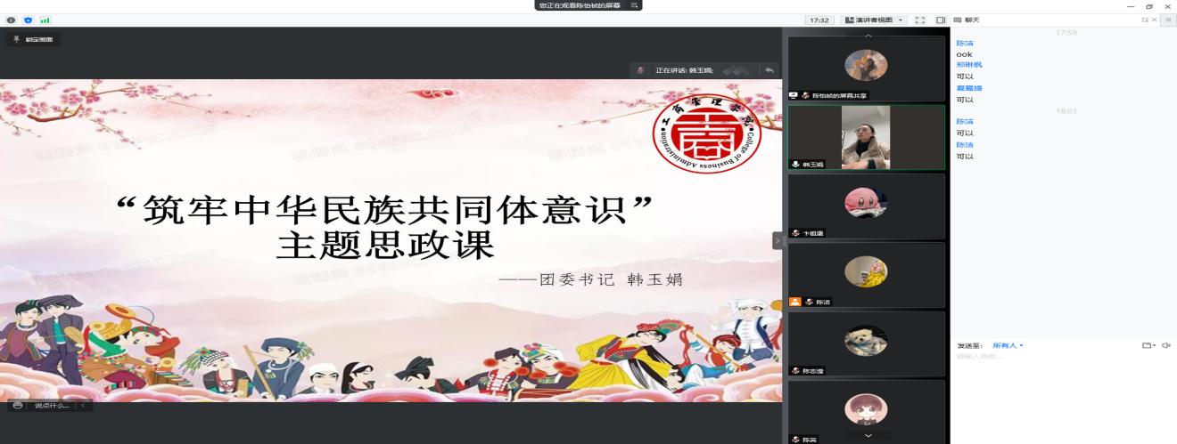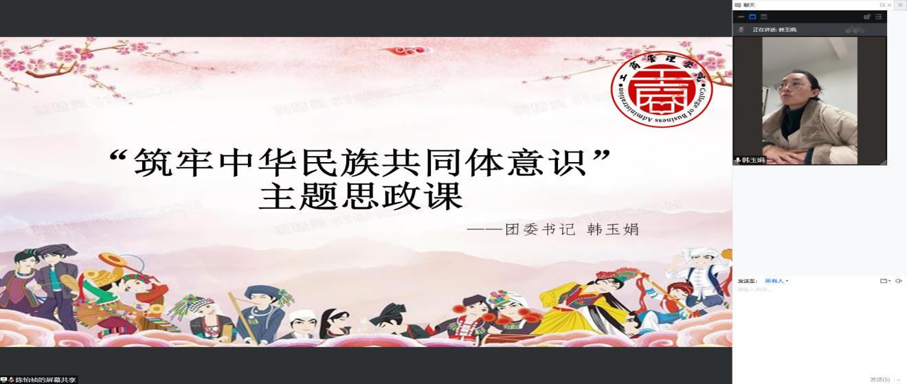 为了铸牢中华民族共同体意识,增强对中华民族大家庭的归属感和认同感,巩固和发展平等、团结、互助、和谐和你中有我、我中有你的社会主义新型民族关系,推动中华各民族繁荣蓬勃发展,BB贝博艾弗森原官方网站于2022年4月1日举办“铸牢中华民族共同体意识”线上主题思政课,团委书记韩玉娟任主讲老师。