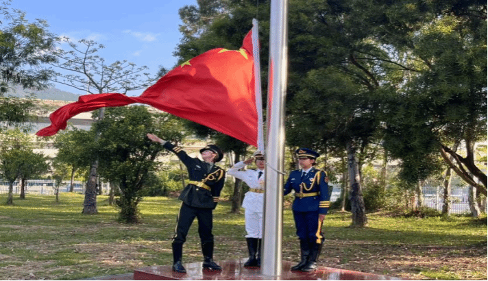 上午7点,升旗仪式开始。迎着朝阳,国旗护卫队迈着整齐划一、铿锵有力的步伐,护卫着鲜艳的五星红旗走向旗台,伴随着雄壮的国歌,五星红旗冉冉升起,迎风飘扬,师生庄严肃立,向国旗行注目礼,升旗仪式庄严肃穆。