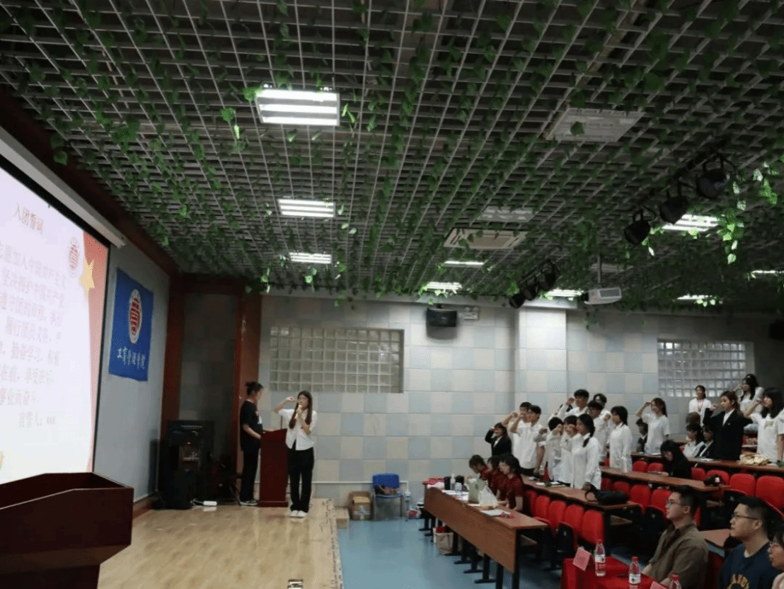 在荣获校“五四奖章”的优秀团员高冰冰同学的领誓下,新团员们紧握右拳,高声宣读入团誓词。誓言铿锵有力,回荡在会场每一个角落。新团员代表吴婧分享了加入共青团的喜悦心情,并表示:“要努力成为一个理想远大、信念坚定,将个人理想与国家未来紧密相连的新时代好青年” 。